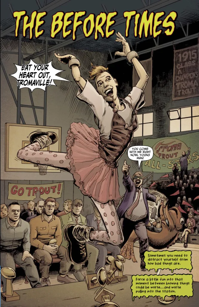 Contrairement au film originel qui est une parodie de film horrifique de vengeance, cette histoire met Toxie face à Biohazard Solutions, qui cherche à éloigner toute attention médiatique de la catastrophe que vit Tromaville. À ce titre, on est plus proche du second opus cinématographique de 1985 (vous cassez pas la nénette, c’est franchement pas le meilleur de la série). De quoi sortir un twist imprévu qui a un but caché sur la longueur et qui sera révélé au lecteur sur la fin de cette première mini-série. Je me demande si c’est réellement une bonne idée mais commercialement parlant, cela peut se tenter.