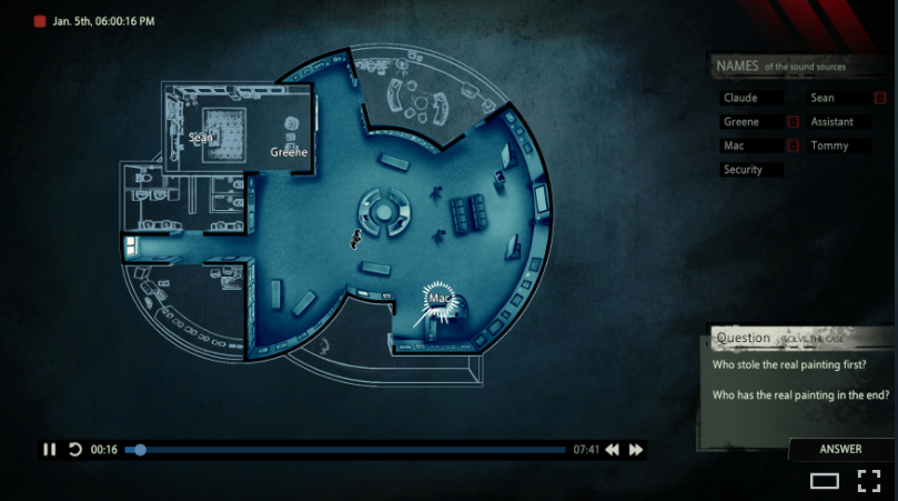 Vous disposez d’un plan dans lequel il faudra se déplacer et d’une bande son regroupant tout ce qui s’est dit durant un laps de temps. Bien entendu, si vous êtes dans une pièce, vous ne pourrez pas entendre ce qui se dit dans une autre. Il faudra donc remonter la bande, recouper les indices, afin de comprendre ce qui s’est réellement passé.